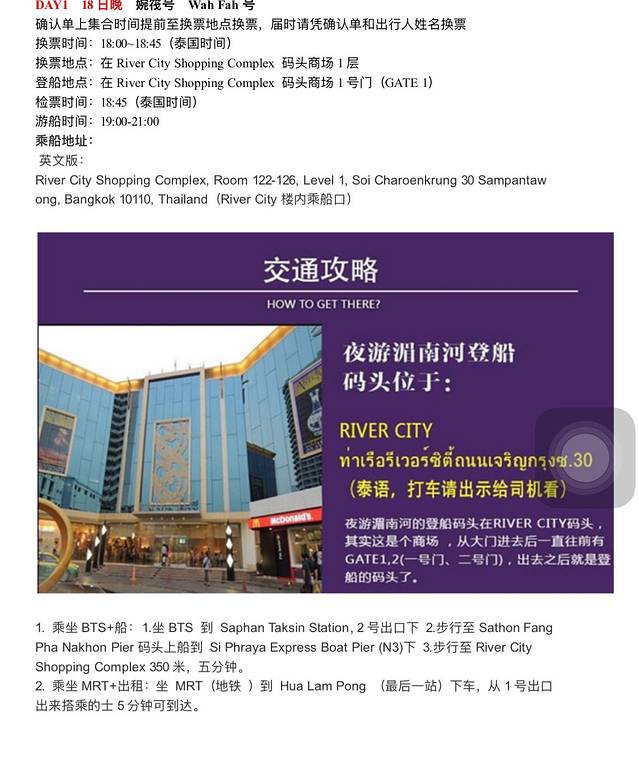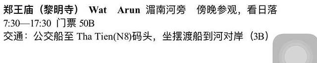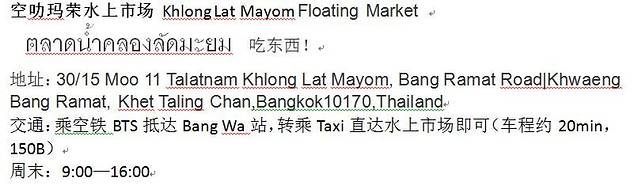 这是我自己做的行程安排的截图,泰文是那个水上市场的名称,可以给出租车师傅看。上面交通那里说了哦,我们从空叻玛荣水上市场回Bang wa站打表只花了80几株,虽然去的时候打的花了200株。要注意的是这个水上市场只在周末有。