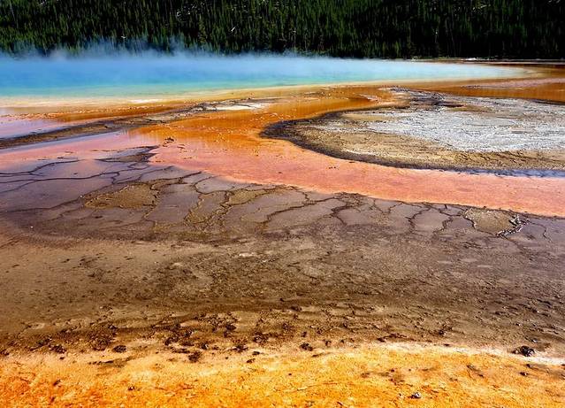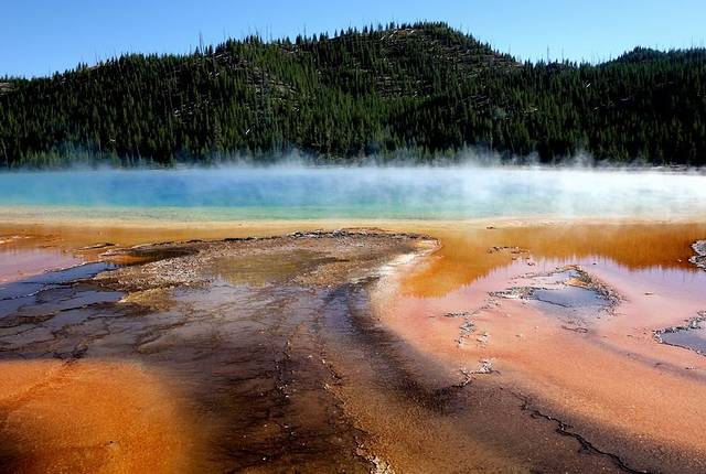 大棱镜温泉(又称大虹彩温泉),是美国最大,世界第三大的温泉。大棱镜温泉的美在于湖面的颜色随季节而改变,夏季,湖面从绿色变为灿烂的橙红色,这是由于富含矿物质的水体中生活着的藻类和含色素的细菌等微生物,它们体内的叶绿素和类胡萝卜素的比例会随季节变换而改变,于是水体也就呈现出不同的色彩。