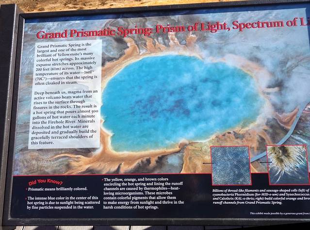 离开老忠实间歇泉,我们前往中途间歇泉盆地(Midway Geyser Basin)的大棱镜温泉(Grand Prismatic Spring)。图为中途间歇泉盆地的导游图。