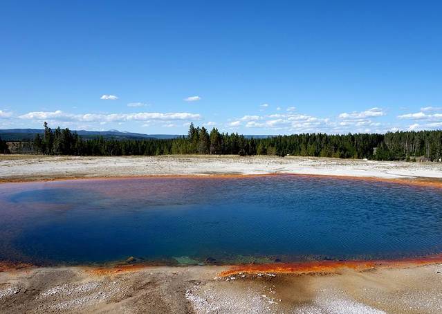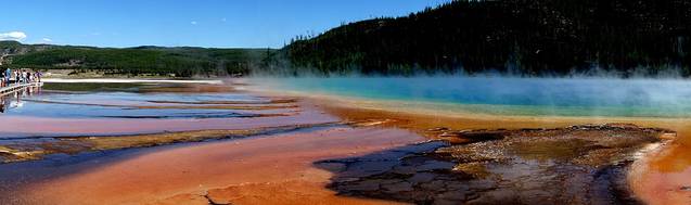 大棱镜温泉(又称大虹彩温泉),是美国最大,世界第三大的温泉。大棱镜温泉的美在于湖面的颜色随季节而改变,夏季,湖面从绿色变为灿烂的橙红色,这是由于富含矿物质的水体中生活着的藻类和含色素的细菌等微生物,它们体内的叶绿素和类胡萝卜素的比例会随季节变换而改变,于是水体也就呈现出不同的色彩。图为大棱镜全景。
