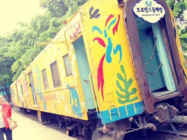 利用废弃的火车,涂上好看的颜色而加以利用。