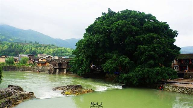 溪岸边,由13棵百年、千年老榕组成的榕树群蔚为壮观。水车就在榕树旁,这景色,构成云水谣最有代表性的云水画面