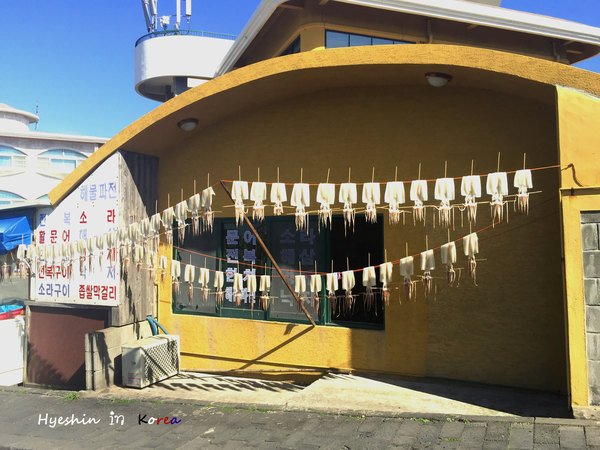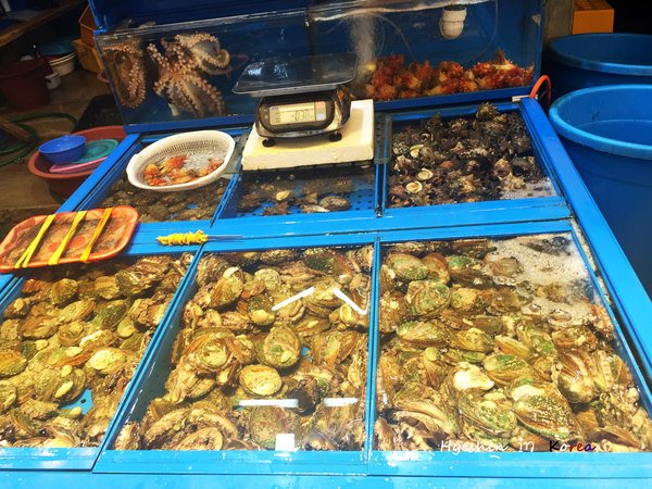 卖海鲜的非常多,和老妈挑战了一份生鱼片,1w韩元一份很多店都有卖,配有酱料。