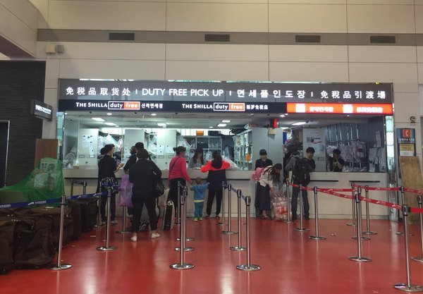领了登机牌过了安检,就是新罗免税店的提货处了。只从新罗买了,就在新罗提,这个时间点人不多。提货的时候工作人员会帮你对账,对好了签字,如果人多来不及取货,也可以邮寄和退货,到时候可以打新罗免税店的电话咨询。