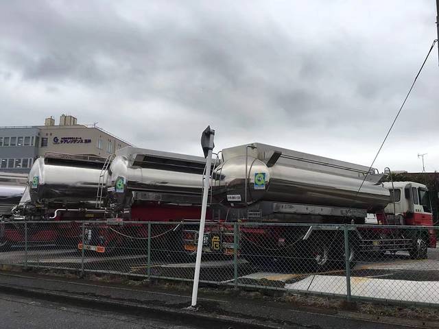 日本的所有车都特干净,这种油罐车都是不锈钢的。