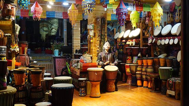 古城里80%的手鼓店都是同一个曲子:《小宝贝》,拼的估计就是打鼓妹子的颜值了