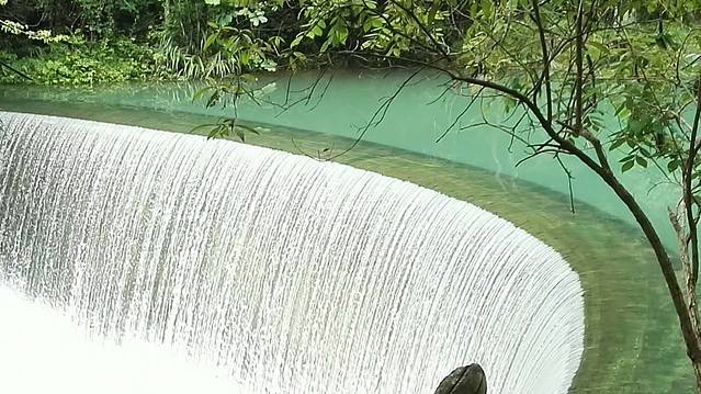 潭水湛蓝而深远,垂帘般的水柱,飞流直下,宛如人间仙境