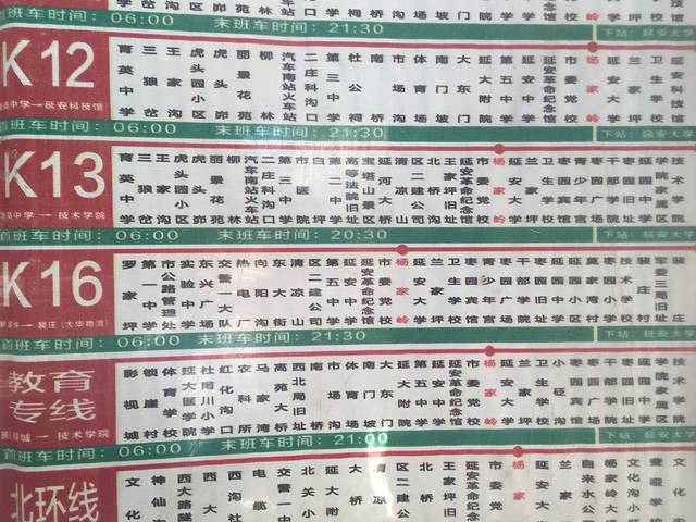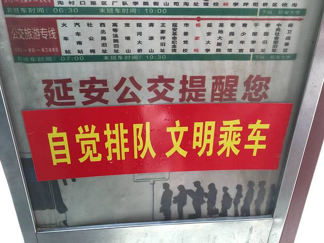 延安不大,市内的景区都不远,公交车一趟线就走下来了,开车一条大直路一直走。多条线路,K12, K13, K16,8路,1路,到个别景区。 旅游专线贯穿所有景区。延安的公交都是2块,时间大概都是早6:00到晚上20:30或者21:30