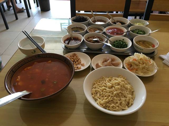 下火车之后先坐2路公交车到治沙所下车,这个吃了个抿节,早9点开门,一大堆,很划算,团购12,还可以加面,人多建议来个小炒肉