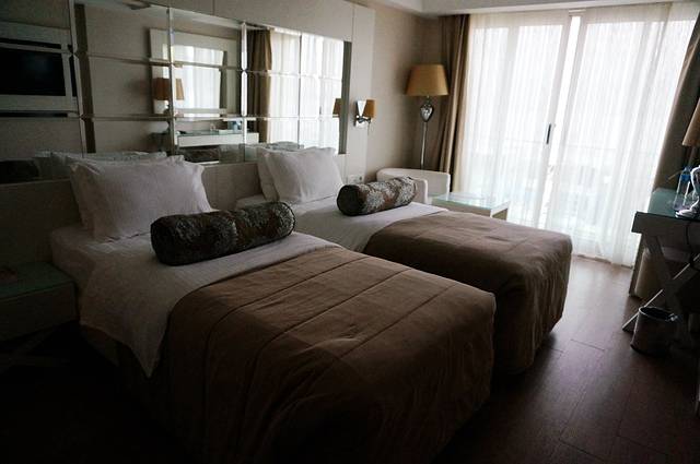 房间嘛,我们定的是标准的双床间,也没定海景房,所以只有部分海景,也就是从露台能看到一点点海。房间提供mini bar和热水壶。酒店还提供免费代泊车,很方便。
