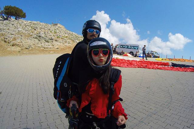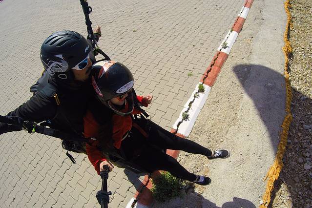 起飞的时候要带上头盔,教练会带着你一起跑,但是我腿比较短,感觉没跑两步就坐下了,被教练带着跑。