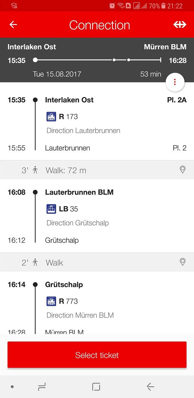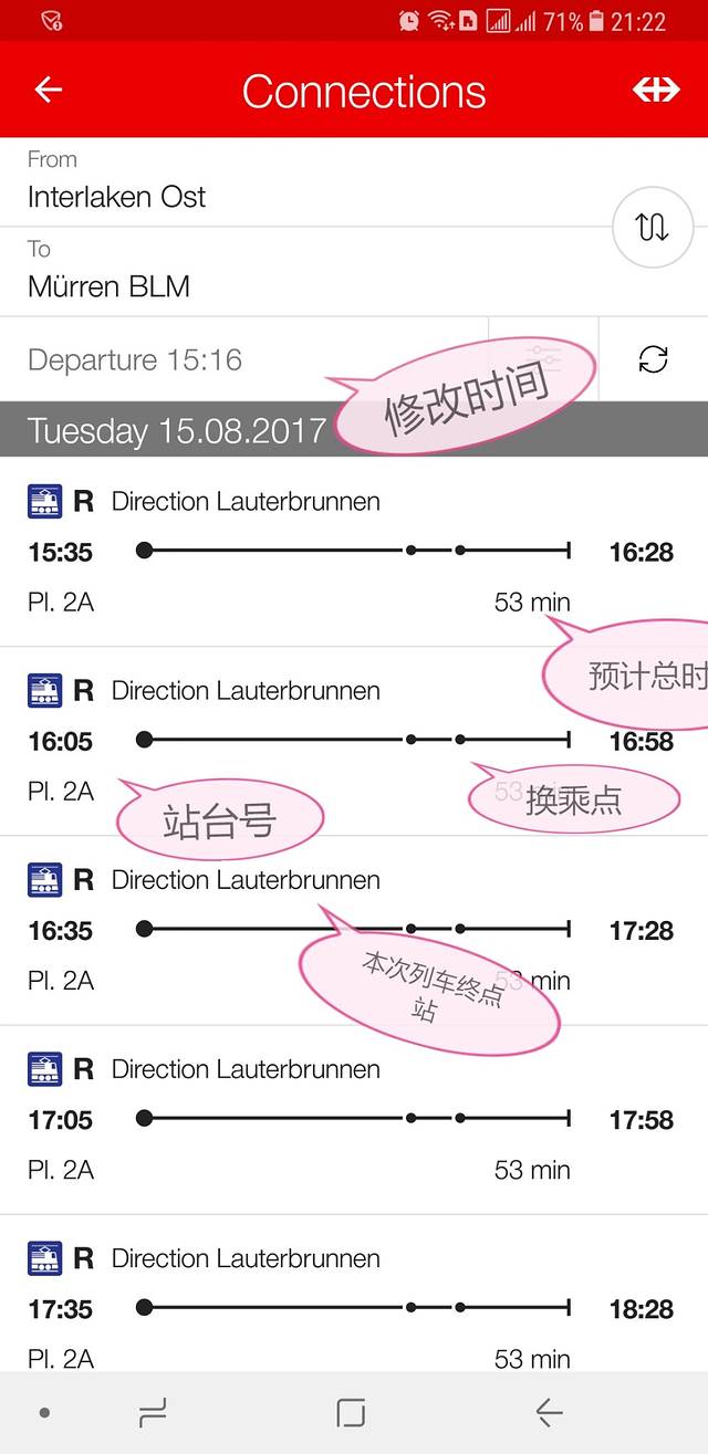 点进去后看到换乘信息,从因特拉肯到米伦的换乘