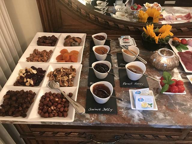 最最最赞的就是这家酒店的早餐了,早餐就在二楼的餐厅,这些都是给我们一家人的,这些是果酱、坚果、奶酪、熏肉等