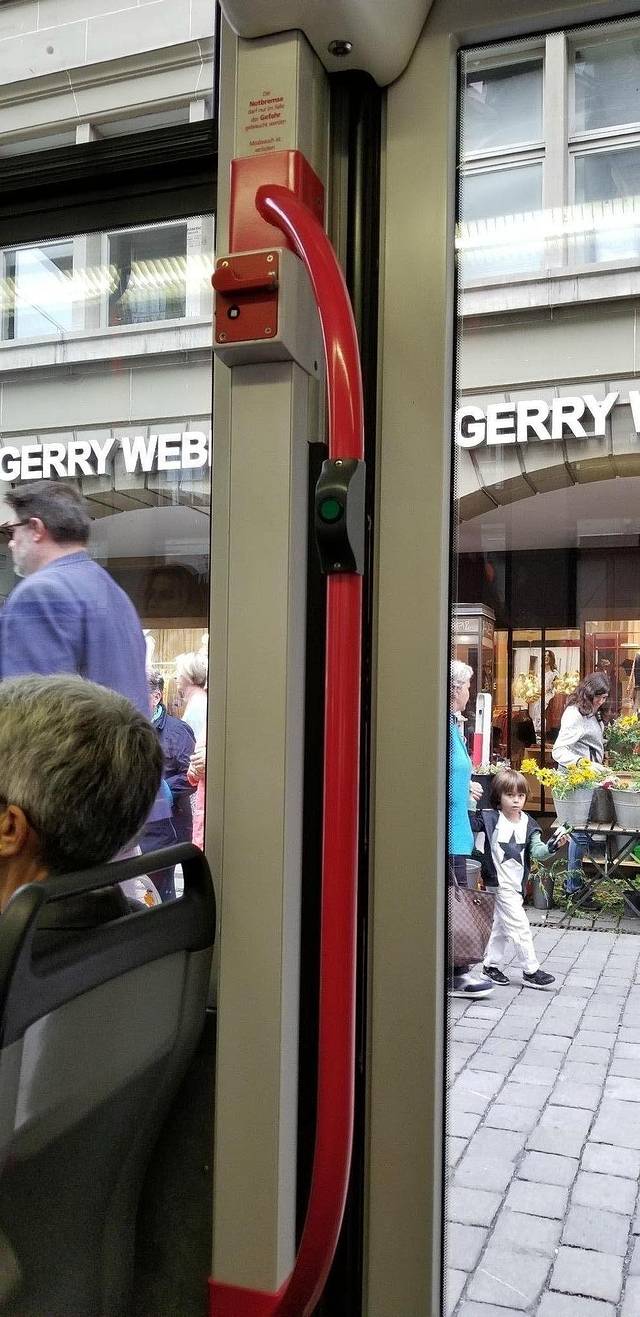 无论是电车、火车、公交车,上下都有一个按钮,这个是下车用的,你看到显示屏上本站要下的话,就要按这个扭,要不车就不会停。所以在瑞士做公交一定要集中注意力,如果有8站到目的地的话,车不一定会停8次。一定要利用google地图确认到了哪一站。