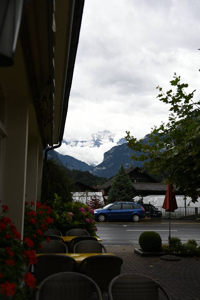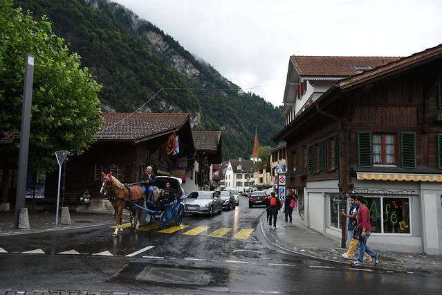 初到因特拉肯,雨中的城市非常的安静,远处群山环绕,一种安详的感觉油然而生。路上看到一辆马车经过,旁边的火车、汽车也都同行,很是和谐。