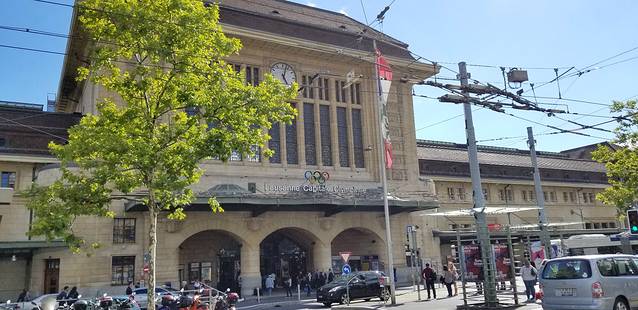 洛桑火车站,有标志性的奥运五环标志,车站对面乘电梯下楼,坐地铁去码头