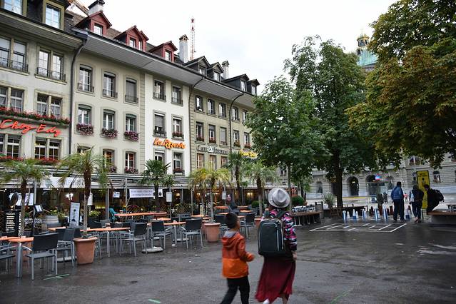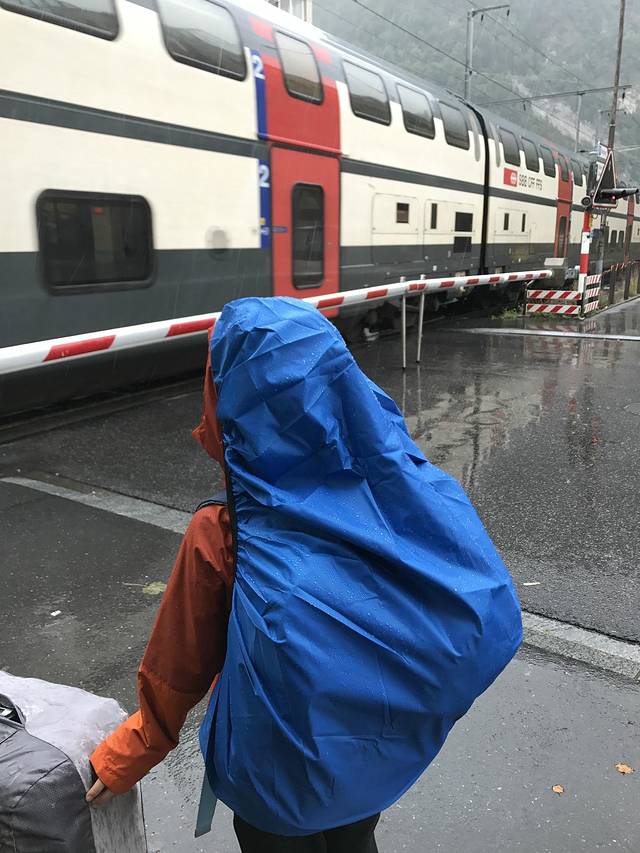 从Interlaken Ost转到West,火车、公交都行,雨已经很大了,把包给保护起来,接着走。