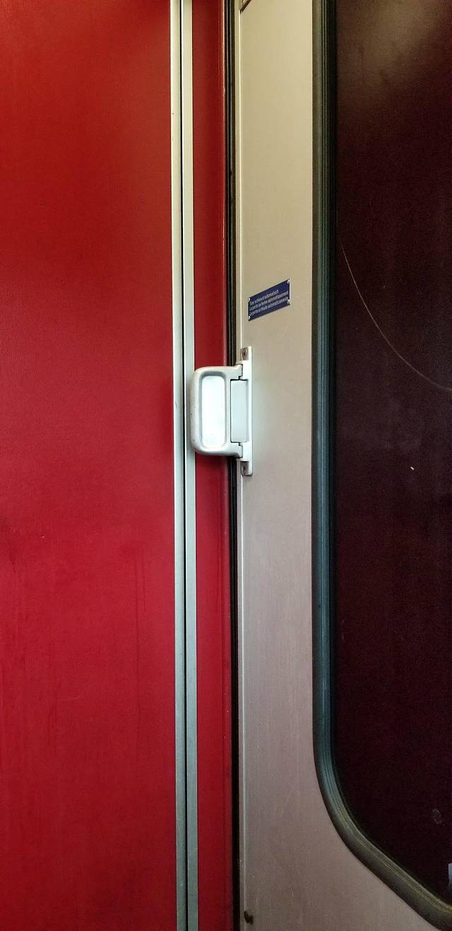 这里的火车车厢间门是关的,要拉这个把手才能打开