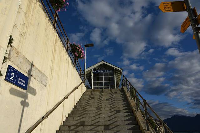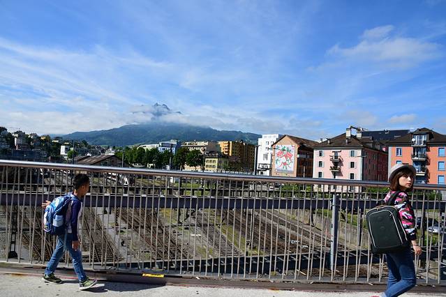 下了火车,准备到对面坐公交车,长长的自动扶梯居然没有电,抬着两个箱子下楼,我们就来到了法语区蒙特勒