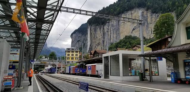 今天去的第一个地方是Lauterbrunnen(劳特布伦嫩),方向和昨天格林德瓦一样。刚下车,映入眼帘的就是标志性的瀑布。这里的储存箱比较小,放不下大箱子,可以存到图片右边的柜台那里