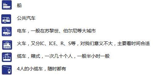 4. 必备软件,一. google map,市内交通,公交、电车查询,重要信息就是时间和过程中的站名;二. SBB Mobile,Swiss pass匹配的软件,对于城市之间的、城市内的所有交通信息都能查询,包括火车、电车、公交、船、缆车等,不仅能查到时间、车次,还会包含转乘信息,非常方便。实际使用时感觉城际间的火车非常的精准,但市内的公交不如google map。翻译软件用不用,不影响基本的出行。