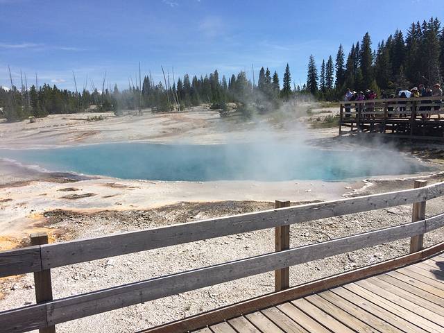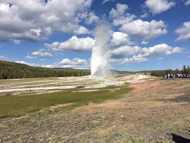 第二个景点就是老忠实喷泉,去了观台上围了好多人,旁边还有饭店可以在二楼观景台上等待它喷。我们一共看了两回,觉得还是在观台的第一圈比较好,太阳很晒,最好背对太阳,看的清楚。老忠实喷泉真的忠实,一个小时喷一次,喷发的时候很壮观,可以感受到大自然的力量和奇妙。