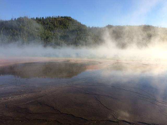 继续前行,midway geyser basin,介绍说是世界上最大的两个间歇泉湖,但是这个我们去看的时候太阳快下山了,有点凉了,就热气腾腾的,看不清全貌,有些遗憾,不过看到的部分还是妖艳的,看不清的雾气腾腾的令人感觉更加神秘,还是想起了美国童话里展现的魔镜。。。