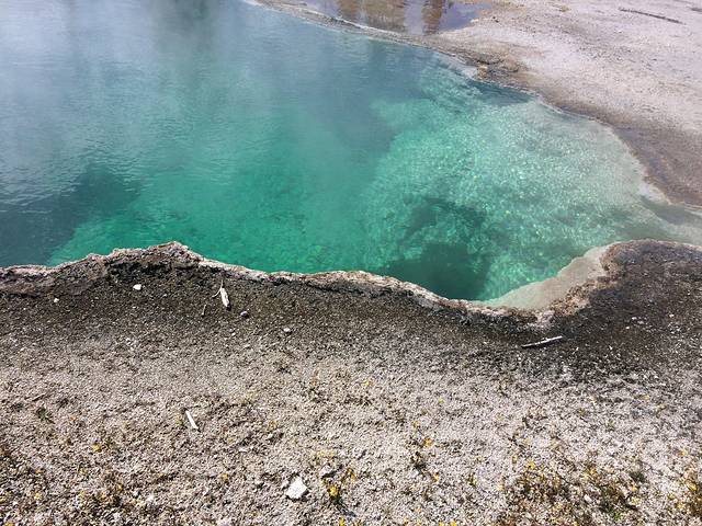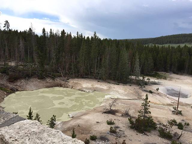 第一个景点就是west thumb geyser basin。比较之后的感觉这里应该是间歇泉眼最多的地方了,五颜六色的,对于我们刚刚到达这里的人倍感兴奋和惊奇,一个个泉眼冒着热气,五颜六色的,大多数都冒着各种各样的泡,非常漂亮和神奇。