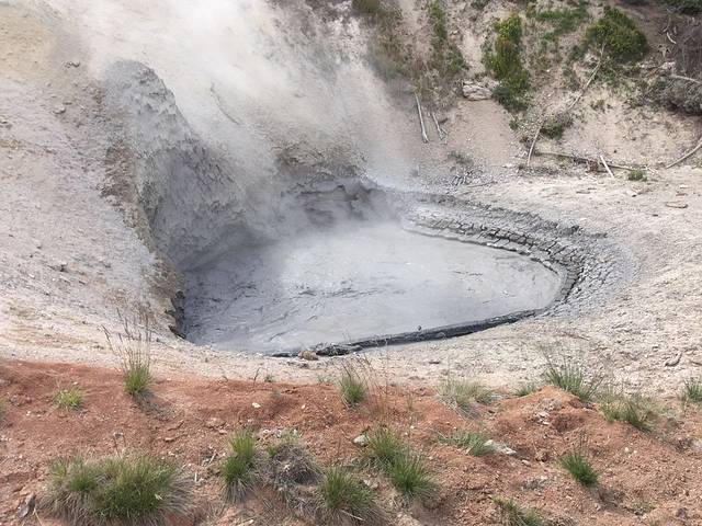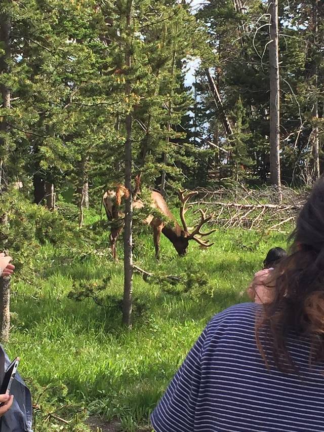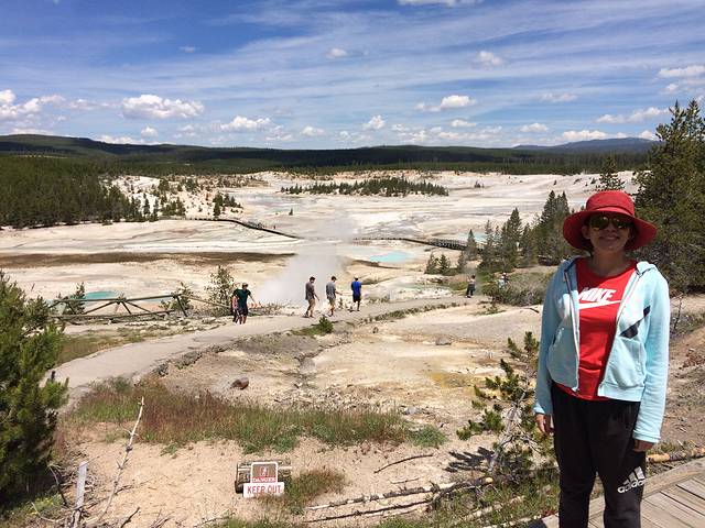 在老忠实那又看了一回喷发,还碰巧遇到一只牦牛在老忠实喷泉里吃草,它累了就往边上一坐,就坐在距离观台50米出,看着里三层外三层的人们给它和喷泉一起合影拍照,好极了呢!