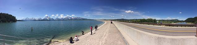 从jenny lake下来,继续前行,沿途主要是雪山与湖水的景色,随时可以在有停车的地方下来,停顿一下欣赏美景。沿着提顿国家公园最大的湖一直开车前行,有一个桥,桥下面是水坝,地图上叫jackson lake dam(river access)感觉应该是发电的,旁边可以欣赏美景,感觉这里的景色最美,虽然是雪山的侧面,但是欣赏到的雪山线最长,还是不错的!