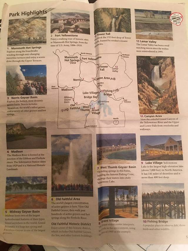 之后下午3点左右我们就沿着路继续北上,到达黄石公园。这时天还感觉正午的样子,嗮得很。我们就按我们之前计划的先游览西边一撇的黄石。入门的时候会发报纸形式的介绍,其中有一页最有用