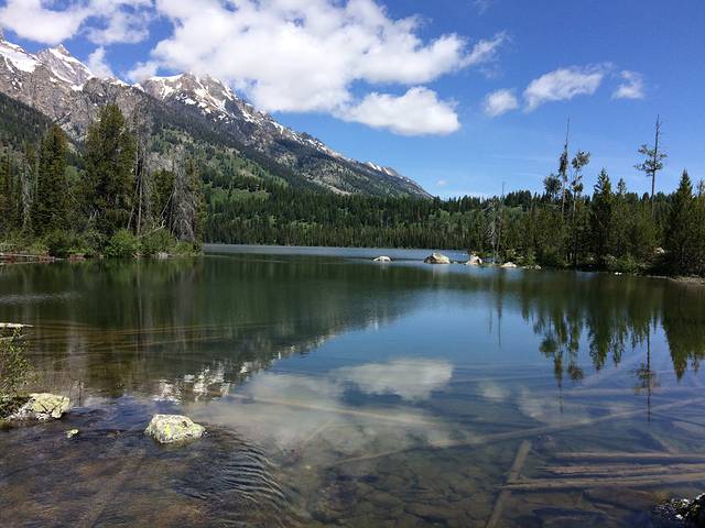 然后下山开车继续前行,来到有名的Jenny lake,说这里的景色最好,确实,这里是看雪山的最佳地点,下车前一定要带银行卡,里面有船可以坐,19刀每人可以在游船上游荡在湖中间近距离的欣赏雪山与湖融为一体的景色。我就是因为没带卡,又不想回去取,就没有坐,还是有些遗憾。。。。。,不过,沿途处处可以看到雪山。