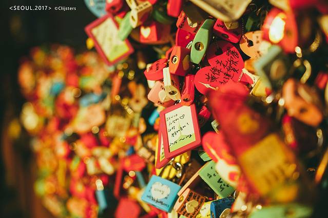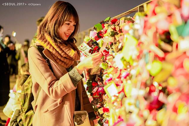 首尔塔下,跟随十指紧扣的情侣们穿过特为情人节而摆设的爱心长廊,