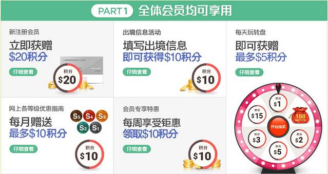 注册新会员可以领20积分,填写入境信息后可以领10积分,千万要记得领。
