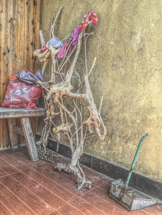 这户人家把几只袜子晾在木架上,我不知道这是人为打造,还是从地下挖出的纠缠在一起的老树根。无论是哪一种,因为它出现在远离城市的农村,就显得普通又常见。若在城市的某个咖啡厅或民宿的角落,我相信一定有很多人忍不住看它几眼,忍不住拍下几张照片,放在朋友圈。