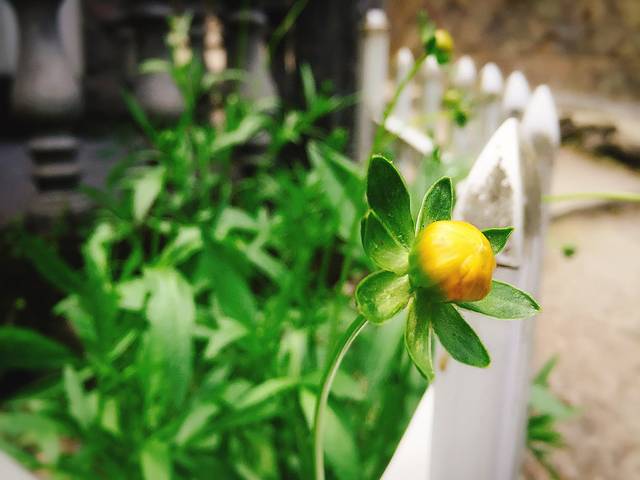 春末的花朵,颜色仍然艳丽,在屋顶点缀着金黄,闪亮着生命。
