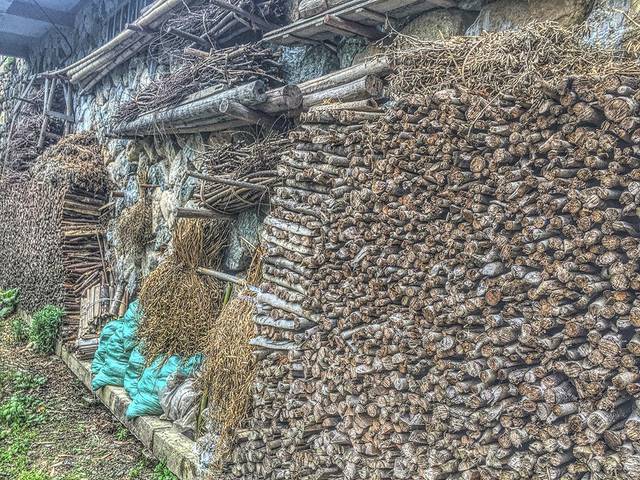 小时候,我们也将干柴收集在一起,也担心被雨水淋湿。而东弄村里的人,将它们存放在屋檐底下,呈现出一种并无规律的杂乱美。