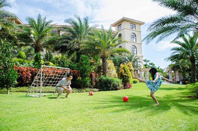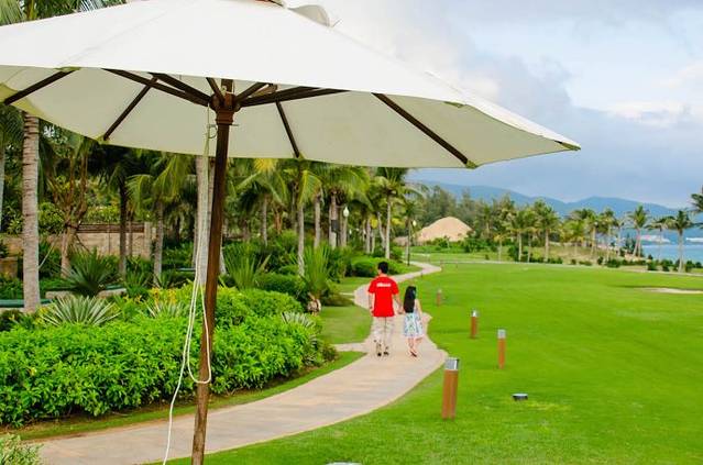 欧式庭院的草坪与园林郁郁葱葱,远处是湛蓝的南中国海,更远处那个小岛就是著名的蜈支洲岛。