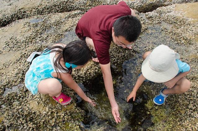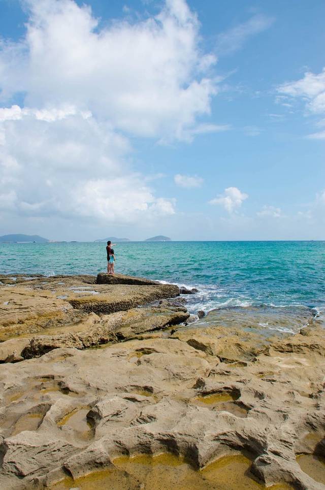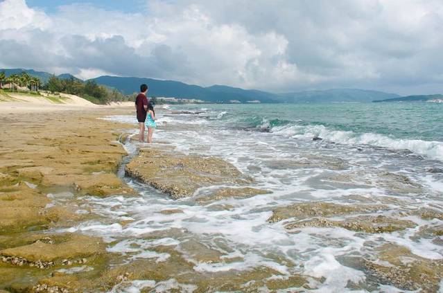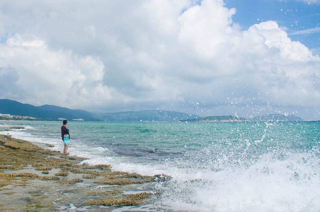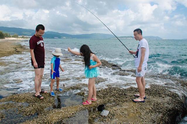 这个地理位置独享了亚龙湾尽头最私密的一片海滩区域,所以即便身处热闹的亚龙湾,海滩上仍不觉得人特别多;同样也是因为在亚龙湾尽头,这里的沙滩虽然算不得亚龙湾最细最好的,却因此而拥有了一片罕见的天然礁石滩,站在上面可以欣赏到一人高的巨浪拍打礁石的壮观景象;退潮后,爸爸和小月格格的乐趣是在礁石上寻找小鱼和小螃蟹,然后把他们送回大海去找妈妈;一对父子在这里海钓,一个小时居然钓上来4、5条Nemo。这个地方简直成了别有乐趣的海上亲子乐园,一连两天,我们都在这里度过美好的傍晚时光。