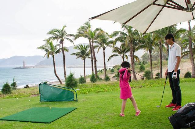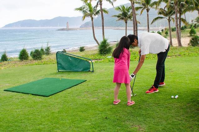 瑞吉度假酒店的东部别墅区前,面对着大海是一片广阔的草坪,这是一个mini高尔夫练习场,在这个风景优美的地方,酒店给小月格格安排了一个小小高尔夫体验课程。