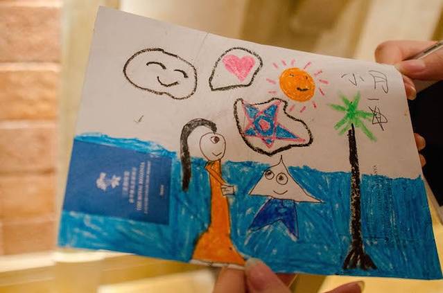 一件可以自由泼墨的白T恤交到小月格格手里,她想了想,在上面认真地画下了蓝天、白云、星星、大海、椰林和海星宝宝,这就是她眼中的三亚。看来在小月格格的心里三亚和海星宝宝已经成功捆绑在一起啦!