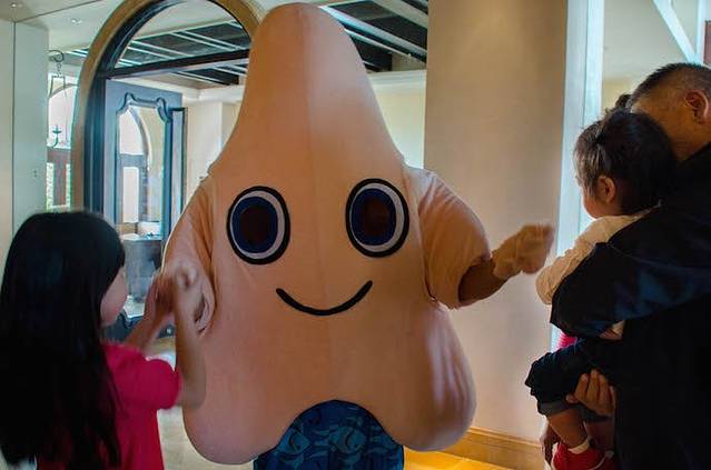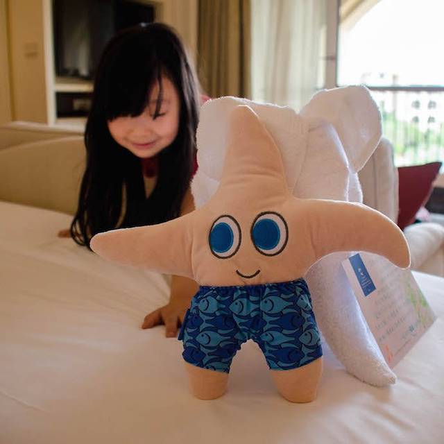 对于小月格格来说,除了美食,这里还有太多让她兴奋得可以说上三天三夜的事。一进酒店,喜达屋海南吉祥物“海星宝宝”正在门口欢迎小朋友呢,自从上次三亚之旅后,小月就成了喜达屋吉祥物“海星宝宝”的疯狂粉丝了,这次“老友”重逢,小月格格几乎是尖叫着奔过去和它拥抱,原谅我的相机没来得及捕捉到她狂喜、狂奔的瞬间。