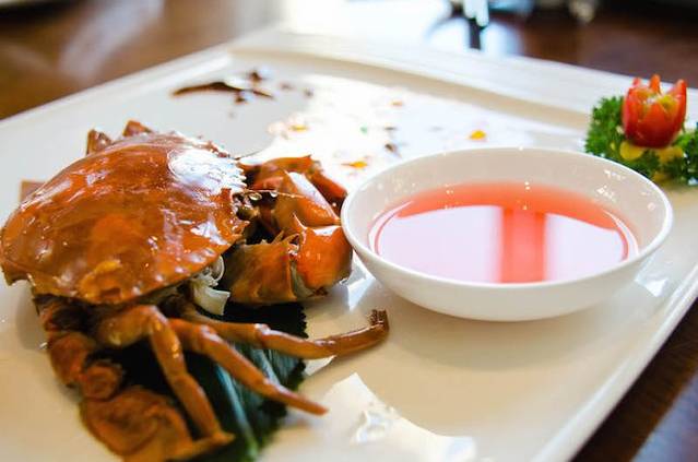 不可不尝的是海南四大名菜之一和乐蟹。这种蟹产于万宁河海交汇处。膏满肉肥,特别是膏脂,金黄油亮,犹如咸蛋黄的色泽,香味扑鼻。几次来三亚都因为季节不对没有品尝到这道美味,这次终于如愿,此行至此已经非常圆满。