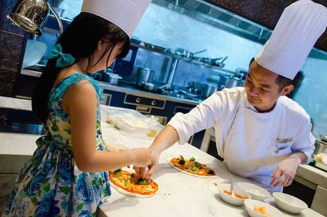 下午的儿童烘焙课也是酒店特别为小朋友们准备的,大厨师帮忙,像模像样地穿戴好,跟着师傅学厨啦!披萨制作即好玩,又简单,小一点的孩子也能跟着学哦。手拍饼坯子最见功力,帅哥大厨师手把手亲授绝技,然后撒上芝士条和各种馅料,入炉静候,香喷喷的披萨出炉啦!自己的劳动成果吃起来就是香!