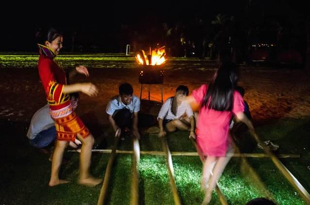 晚上在草坪上,点燃篝火,酒店员工带领着酒店的小客人们一起跳起了具有黎族特色的竹竿舞。很荣幸,小月格格和爸爸被邀请去点燃那天的篝火。