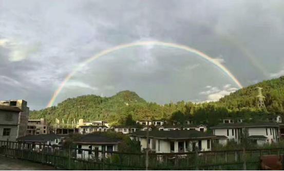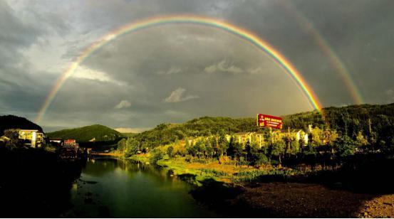 两道彩虹横跨在空中,它仿佛把世上一切最美的颜色都凝固在了这里,淡淡的蓝色、微微的红色、点点的紫色,绚丽的七彩交织成了一座绚丽的天桥,在天空划了一道最美的弧线。