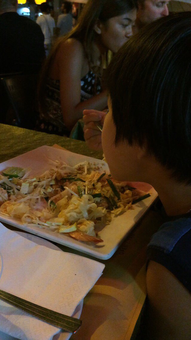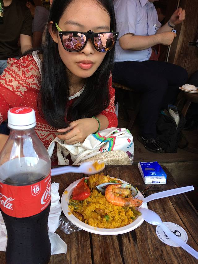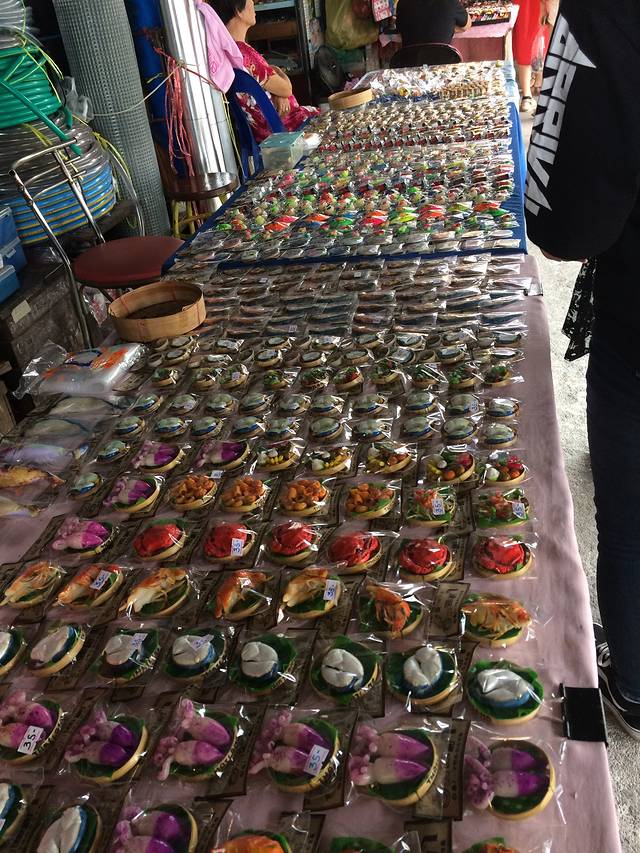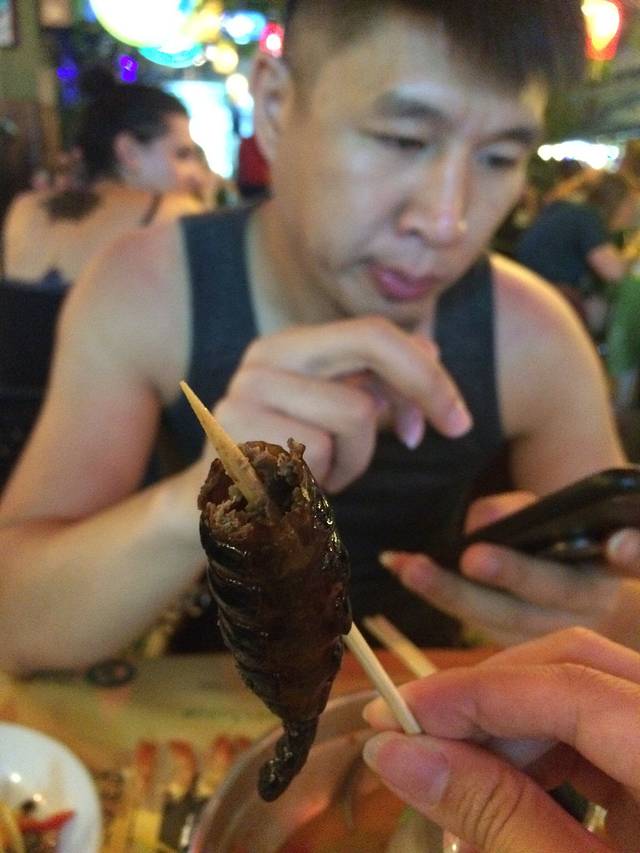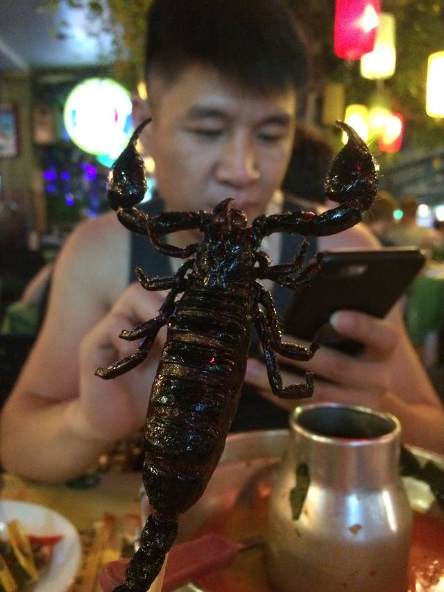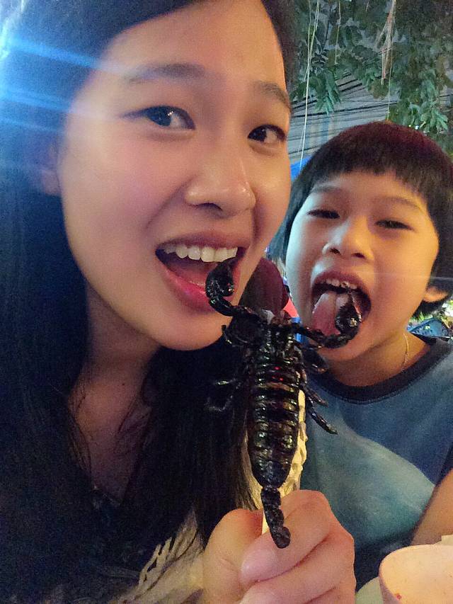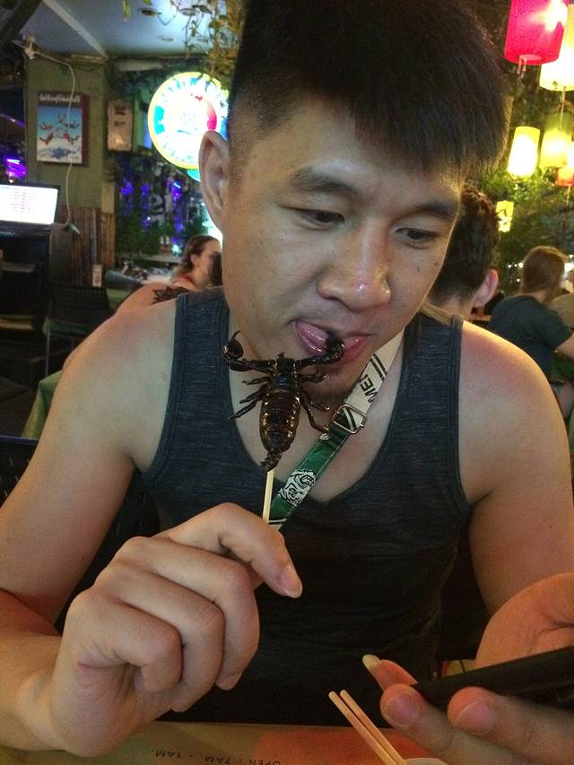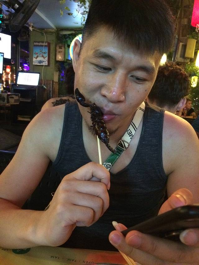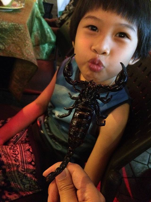 吃饭时,小贩过来兜售各种炸昆虫。买了一只炸蝎子给梁爸爸。我和梁小姐拿着各种装逼拍照