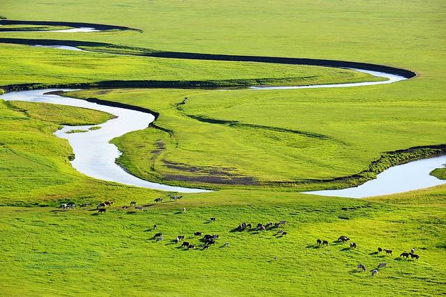 在湿地中的根河,任意、曲折、飘逸如带的流淌着,形成了壮观秀丽的景色。它像一条银色的玉带,在草原上弯弯曲曲,平坦的映衬着湿土,绿草,更显它的幽静,祥和,从容不迫。天然景色与人文景观交相辉映,构成了一道靓丽独特的旅游风景线,这里成为了久居城市的人们心灵停靠休憩的港湾。