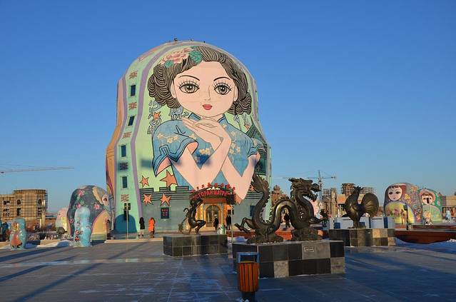 套娃广场,这里是入选世界吉尼斯纪录最大的套娃,俄罗斯没占上最大,却被这里却被这里占有,这里也满是俄罗斯风情建筑。套娃内部是五层楼房。这里,正宗的俄罗斯纪念品、咖啡、巧克力、水晶杯、树皮画、首饰盒琳琅满目。拾阶而上隐约可以听见优美的俄罗斯民歌,顺声寻去,原来这美妙的歌声是从俄罗斯音乐主题酒吧内传出的。