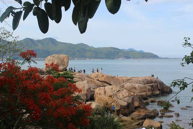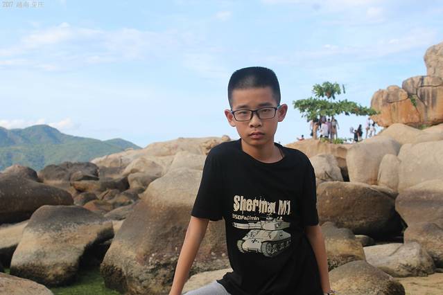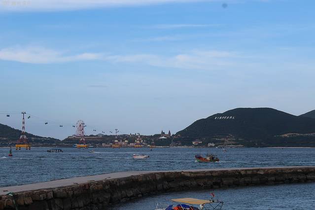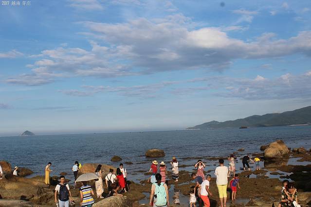 导游介绍说这里叫五指岩,也就是金兰湾的一个有一些大块石头的海滩。钟屿石岬角是一座小小的岬岛,位于芽庄以北1.8公里处,这里有多处巨大的花岗岩海角直指南海之中。它是法国电影《情人》的外景拍摄地之一,电影结尾处,男女主角站在海边的礁石旁,做最后的道别的地方。钟屿石岬角有芽庄少有的花岗岩海岸,突起的岩石朝着大海的方向延伸,可以感受到惊涛拍岸的震撼,而到了日落时,这里换上了浪漫的色彩,晚霞十分迷人,是很多情人约会的最佳去处,漫步在沙滩,感受海风佛面。当然,我们是没有感受到这种风情的。